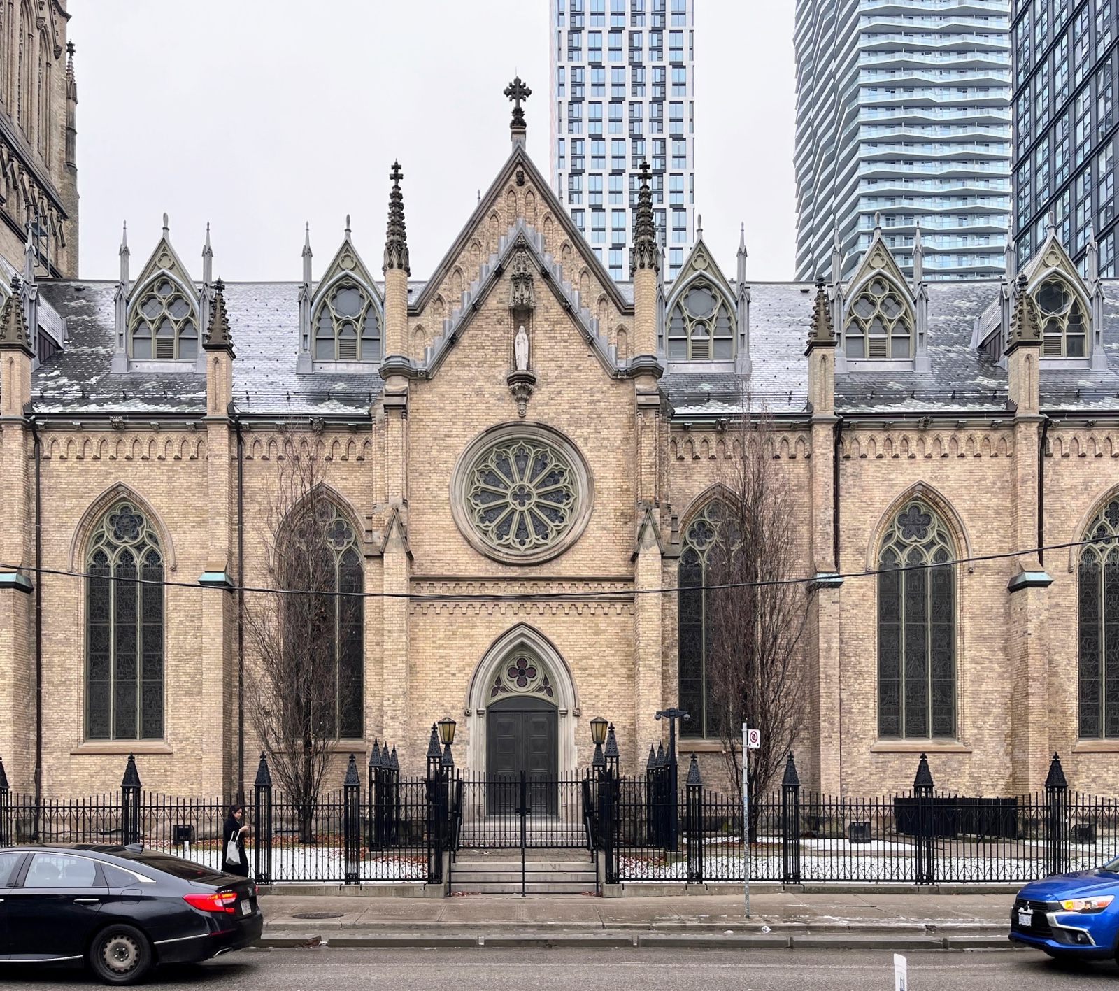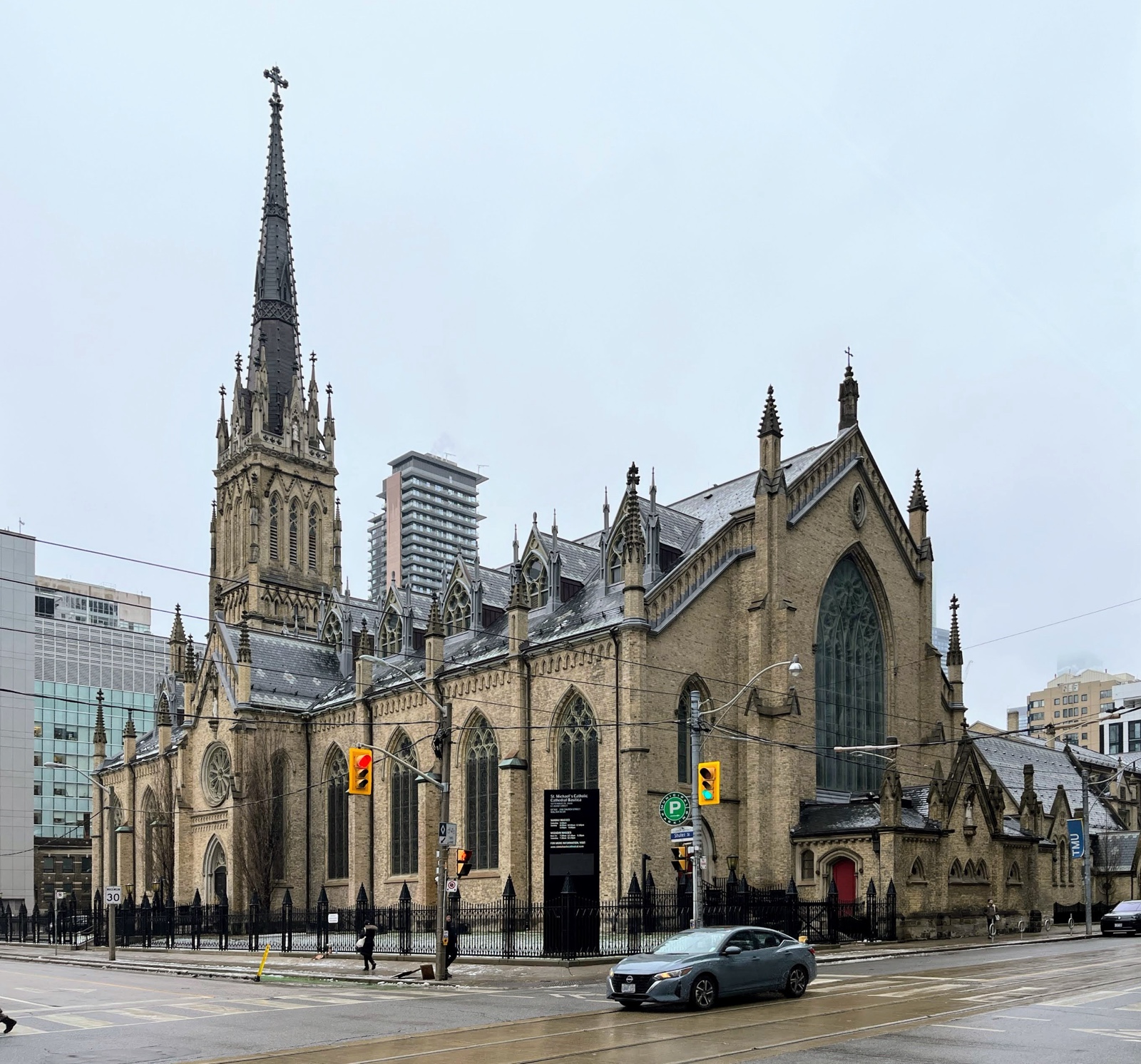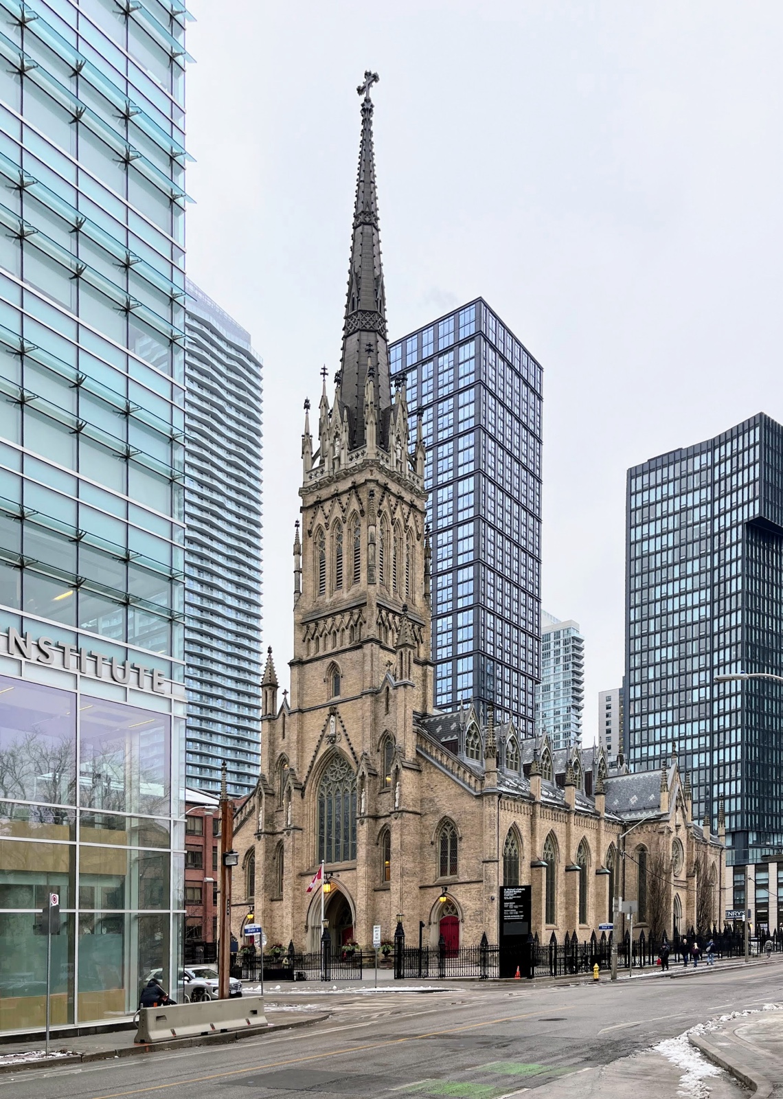 The building was completed in 1848. It became an important spiritual and cultural centre for Catholic immigrants, especially Irish Catholics, in the 19th century Toronto. The original tower and spire were replaced in 2015.