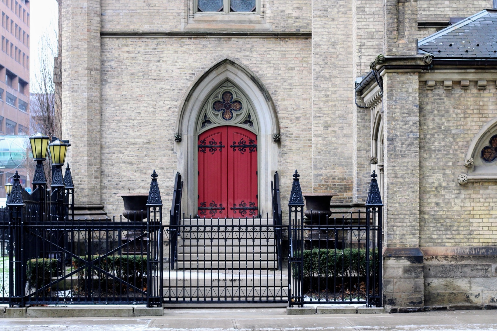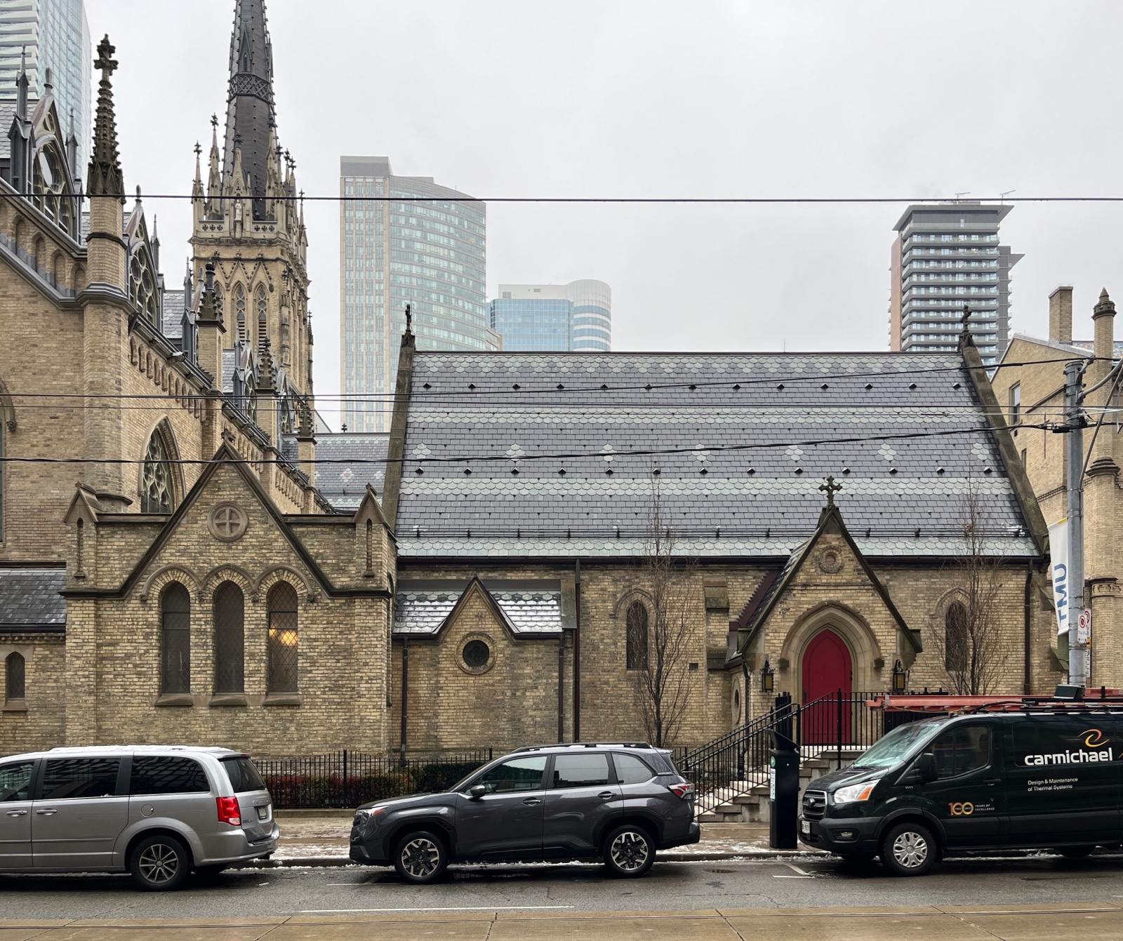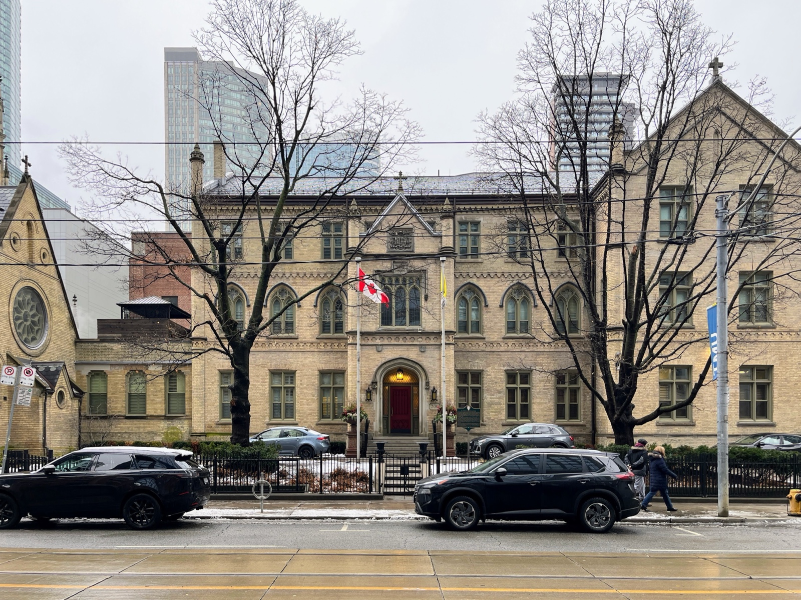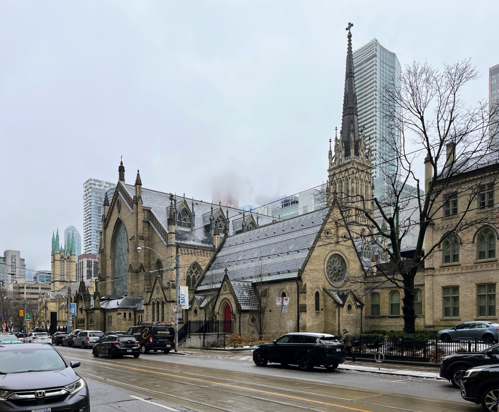 The building was completed in 1848. It became an important spiritual and cultural centre for Catholic immigrants, especially Irish Catholics, in the 19th century Toronto. The original tower and spire were replaced in 2015.