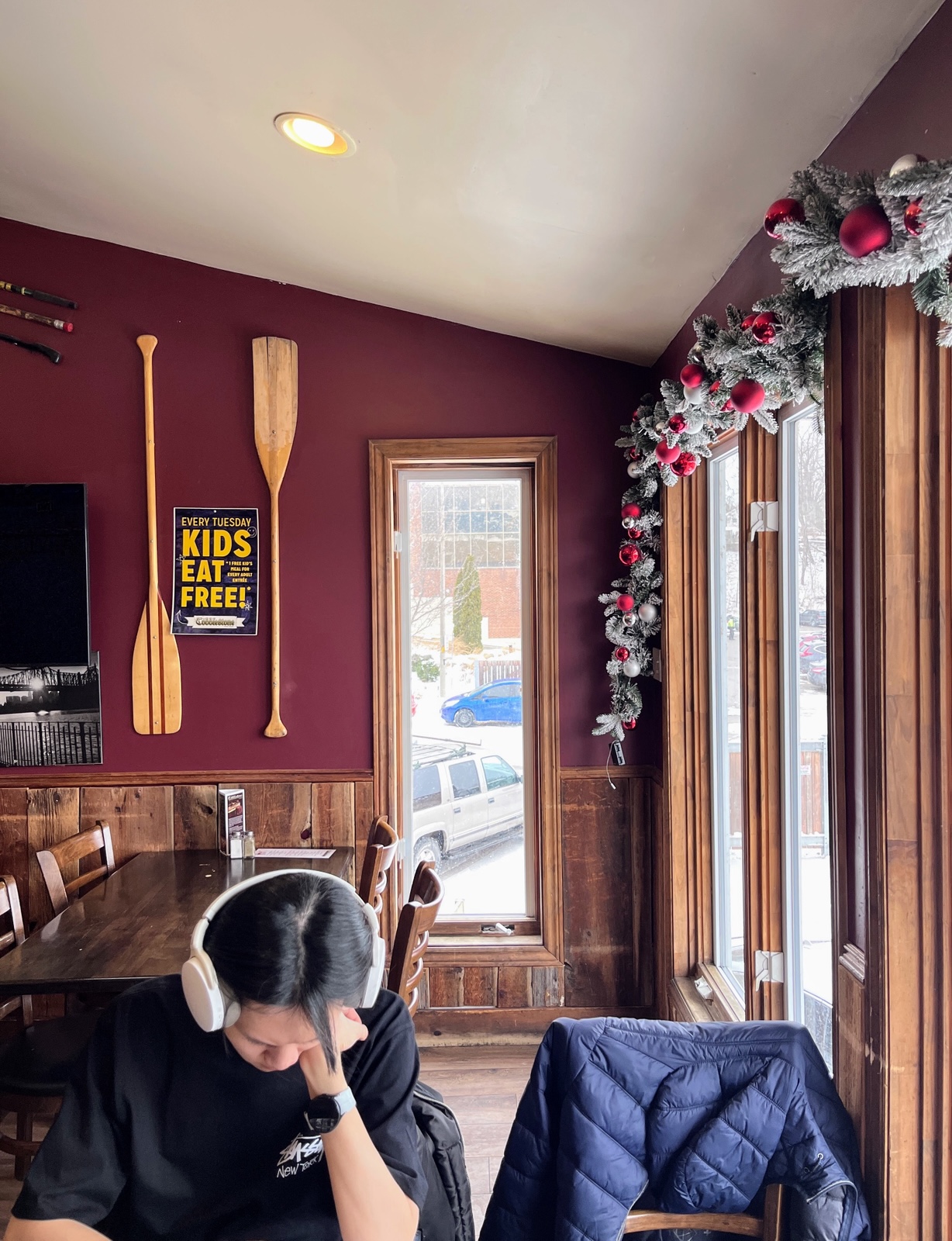 To celebrate New Year’s Eve, we headed to Paris. The server guided us to a river-view table. The snow falling on the river was beautiful, and the food was generous.